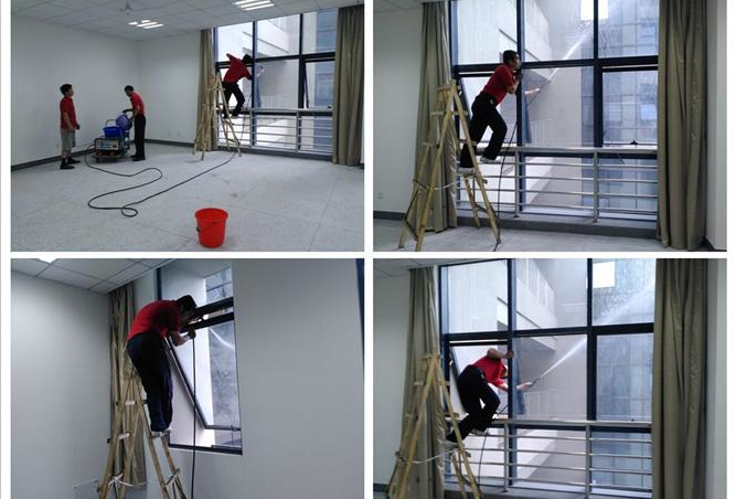 1、擦玻璃。专业的保洁公司会使用玻璃刮、抹水器、无泡玻璃水、强力清洗剂等彻底去除玻璃污渍。(其中窗框有一层保护膜,清理后还需要做专业护理。窗框缝隙空间狭小,对一些顽固的水泥痕渍和胶质等要用铲刀清除)。玻璃经防静电药水擦试后,可保长时间不沾灰,且晶莹光亮!